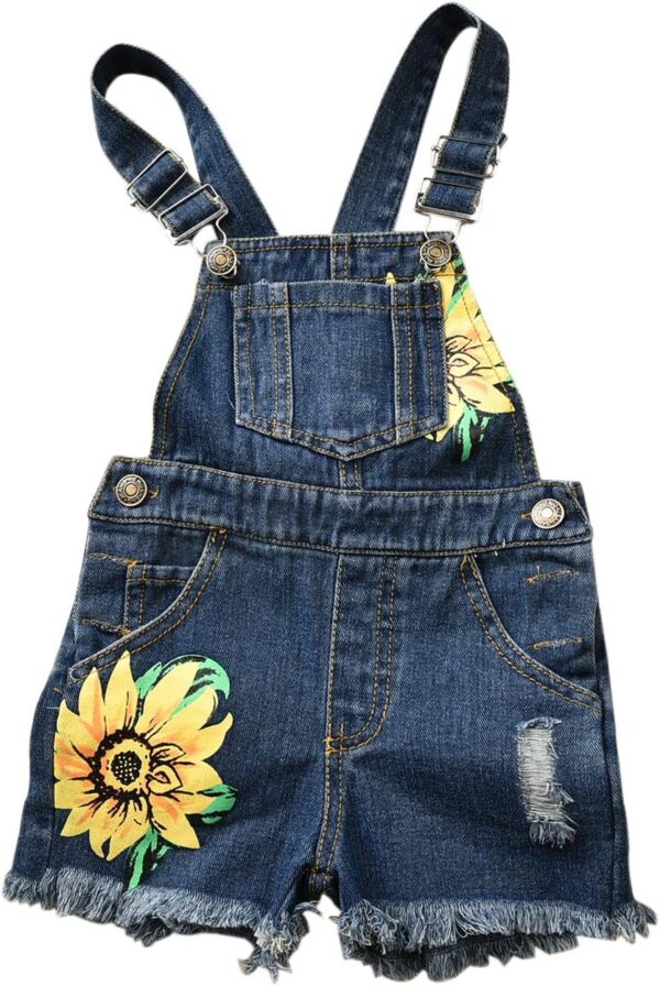 - 🌞🌞🌞【FASHION DESIGN】→Summer denim shorts feature tassel design hem, with two side pockets, front chest pocket and two back pockets, distressed details at the thigh, ripped overall with adjustable shoulder straps, overalls has two Sunflowers, which look more fashionable in summer.