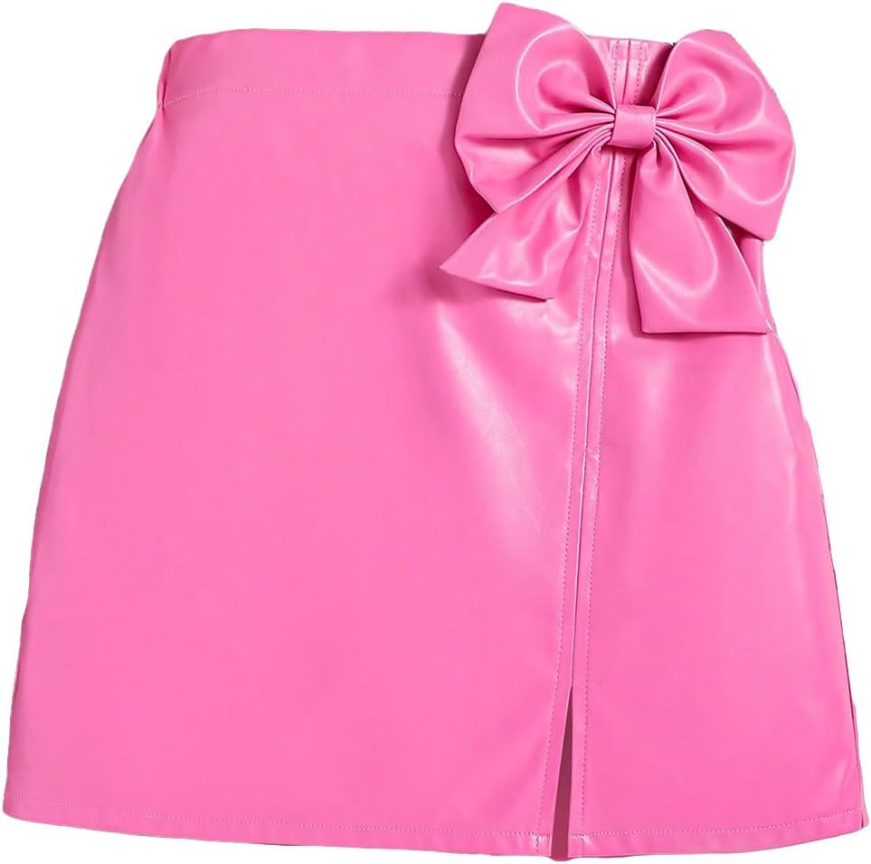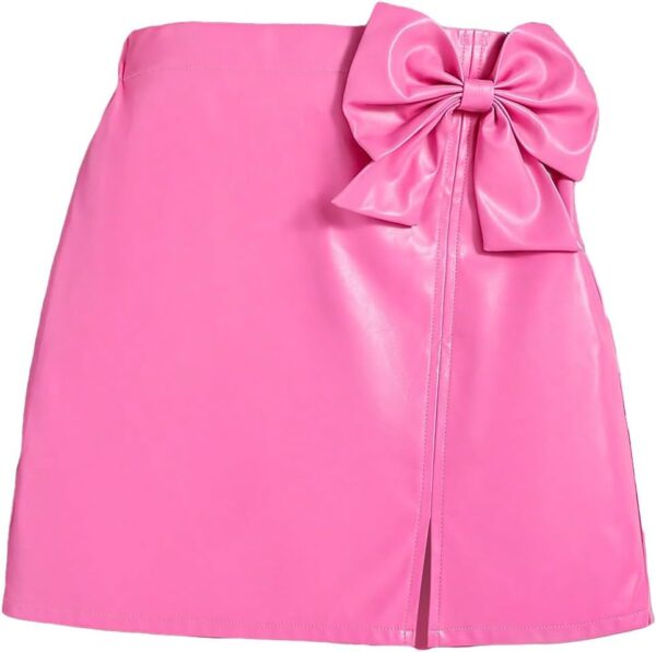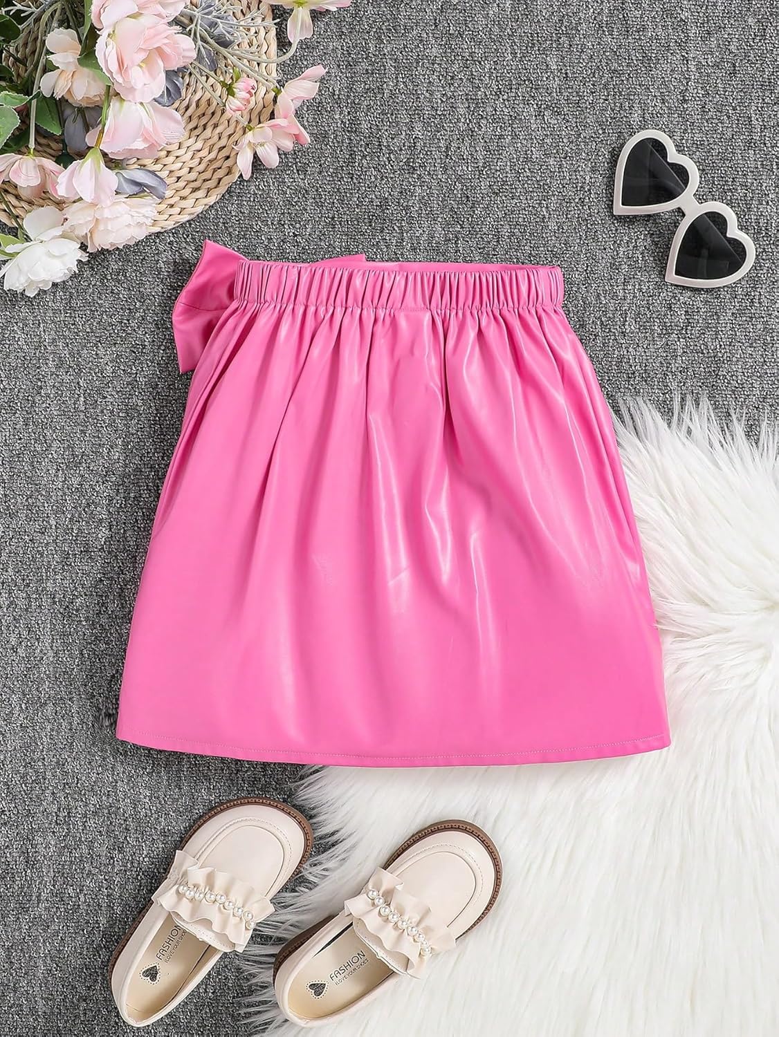 - Feature: Elastic waist, high waist, bow front, split side, PU leather and above the knee length, chic and trendy leather short skirt for girl, make your girl look fashion and cute.